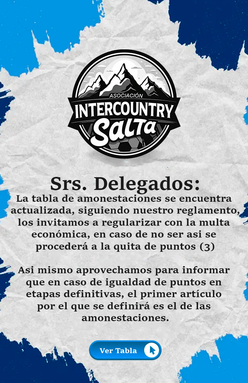 Directiva 25 de junio de 2025 c2840404 Reglamento de Futbol 25 de junio de 2025 c2840404 Reglamento de Futbol Resultados marzo 04, 2026 Zona Oeste F.C 7 - 0 Docente Sur marzo 04, 2026 Otto 2 - 4 Pje. Cafayate febrero 25, 2026 Academy F.C 4 - 2 Docente Sur febrero 25, 2026 Porto 1 - 0 Vallisto F.C febrero 24, 2026 Pje. Cafayate 0 - 0 * Pelusa febrero 24, 2026 La Godoy Cruz 0 - 2 Zona Oeste F.C febrero 24, 2026 Otto 6 - 0 La Juve abril 04, 2026 Zona Oeste F.C suspendido La Fabrica 50/50 abril 04, 2026 Grand Bourg A suspendido Vaca Cubana F.C abril 04, 2026 Vallisto F.C 2 - 0 Docente Sur Tabla de Posiciones Team W L PTS Otto 12 1 37 Pje. Cafayate 12 1 36 Porto 7 3 25 Zona Oeste F.C 7 0 25 La Selección 6 1 22 Vallisto F.C 6 3 22 Academy F.C 5 5 18 La Godoy Cruz 4 5 14 La Brava 3 4 12 GB 3 5 11 AMONESTACIONES Fixture Ver Completo ⚽️ AifSalta 2025 $ 3.000,00 Añadir al carrito 📷 AifSalta 2025 $ 3.000,00 Añadir al carrito 📷 AifSalta 2025 $ 3.000,00 Añadir al carrito 📷 AifSalta 2025 $ 3.000,00 Añadir al carrito 📷 AifSalta 2025 $ 3.000,00 Añadir al carrito 📷 AifSalta 2025 $ 3.000,00 Añadir al carrito